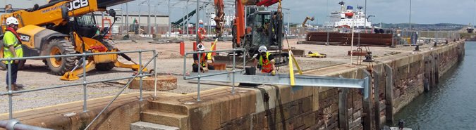 Divers worked below the water level using specialist grout to fix steel frames to the existing harbour wall. A total of 8 steel pontoon guiderails, each measuring 11.4m, were then bolted above and below water to the frames.